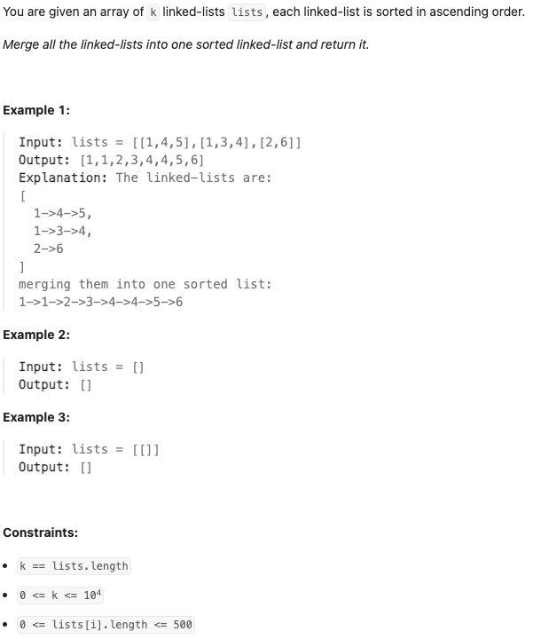/** * Definition for singly-linked list. * public class ListNode { * int val; * ListNode next; * ListNode() {} * ListNode(int val) { this.val = val; } * ListNode(int val, ListNode next) { this.val = val; this.next = next; } * } */ class Solution { public ListNode mergeKLists(ListNode[] lists) { List<Integer> mergeList = new ArrayList<>(); for (ListNode l : lists) { ListNode curr = l; while (curr != null) { mergeList.add(curr.val); curr = curr.next; } } Collections.sort(mergeList); ListNode ans = new ListNode(); ListNode tmp = ans; for (int i : mergeList) { tmp.next = new ListNode(i); tmp = tmp.next; } return ans.next; } }